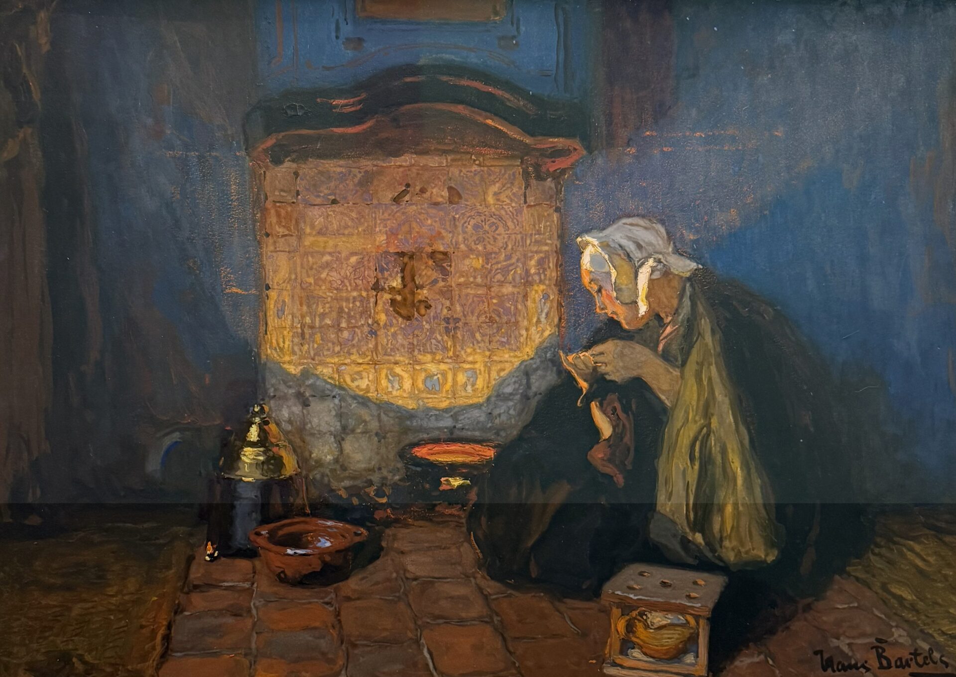 Jonge vissersvrouw met verstelwerk bij haardvuur